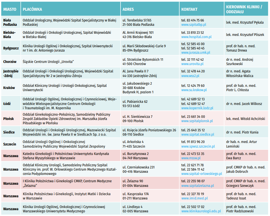 Aktualnie 15 placówek szpitalnych jest przygotowanych do wykonywania zabiegów neuromodulacji krzyżowej – 5 ginekologicznych i 10 urologicznych. Pełną listę przedstawia tabela poniżej.